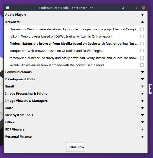 Finally, two new native apps developed by the team to make workflow seamless. One of them is EOS-quickstart which helps you to install necessary applications easily in a new system via its interactive GUI.
